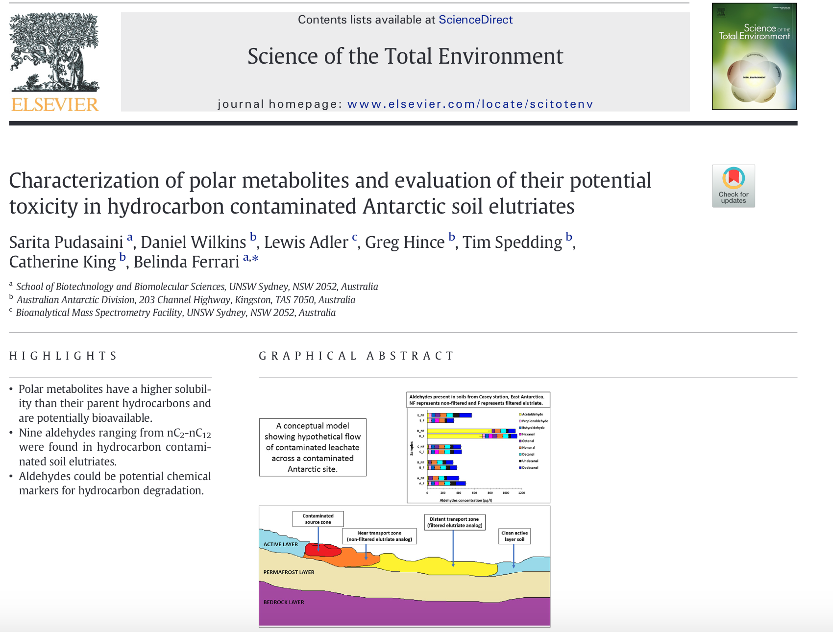 Congratulations to Belinda Ferrari, her team and all those involved in this great publication “Characterization of polar metabolites and evaluation of their potential toxicity in hydrocarbon contaminated Antarctic soil elutriates”.